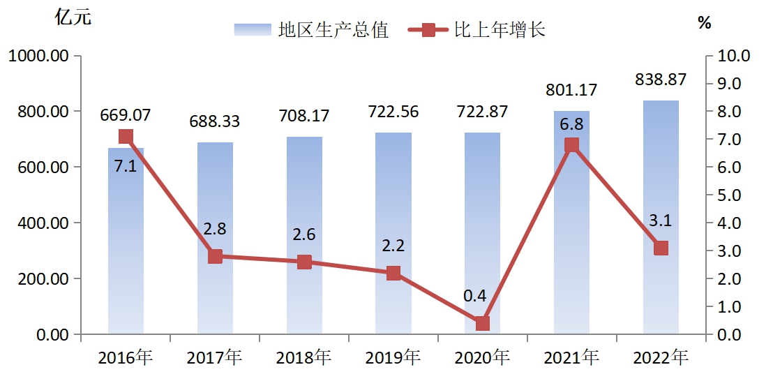 初步核算,全年地区生产总值[2]838.87亿元,比上年增长3.1%。其中,第一产业增加值76.52亿元,增长4.6%;第二产业增加值335.27亿元,增长9.0%;第三产业增加值427.08亿元,下降1.0%。第一产业增加值占地区生产总值比重为9.1%,第二产业增加值比重为40.0%,第三产业增加值比重为50.9%。按常住人口计算,全年人均地区生产总值44007元,比上年增长4.0%。