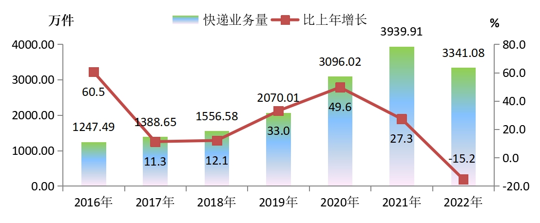 全年邮政行业业务总量8.32亿元,比上年下降6.4%。全年邮政行业寄递业务量完成5324.43万件,下降10.3%。其中,邮政寄递服务业务量1983.35万件,下降0.5%;快递业务量3341.08万件,下降15.2%,快递业务收入4.46亿元,下降10.8%。