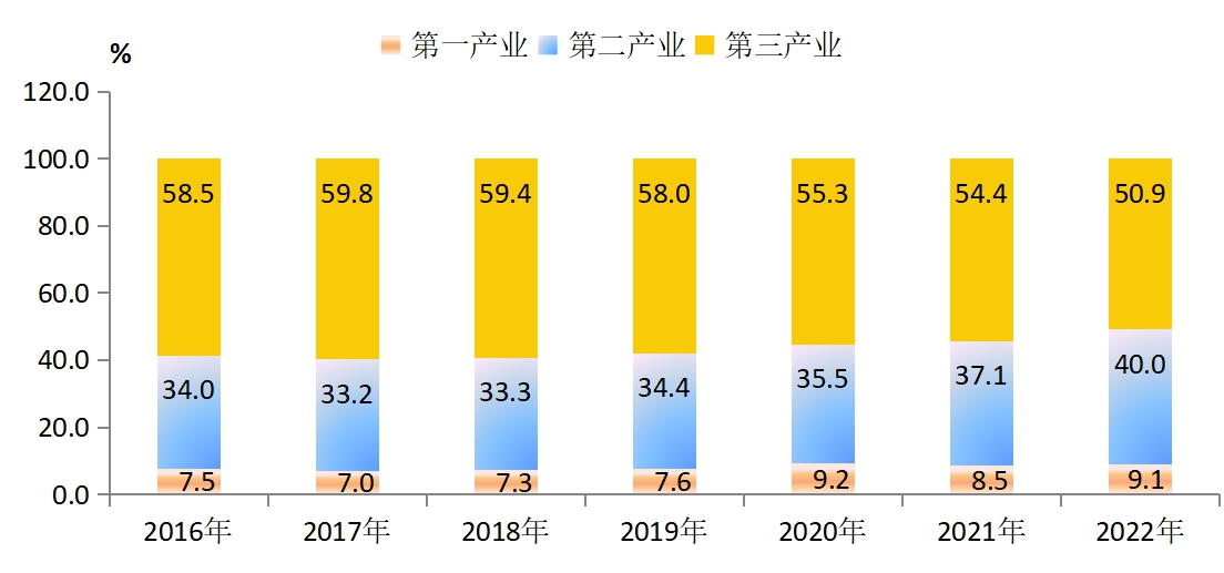 图2 2016-2022年三次产业增加值占地区生产总值比重