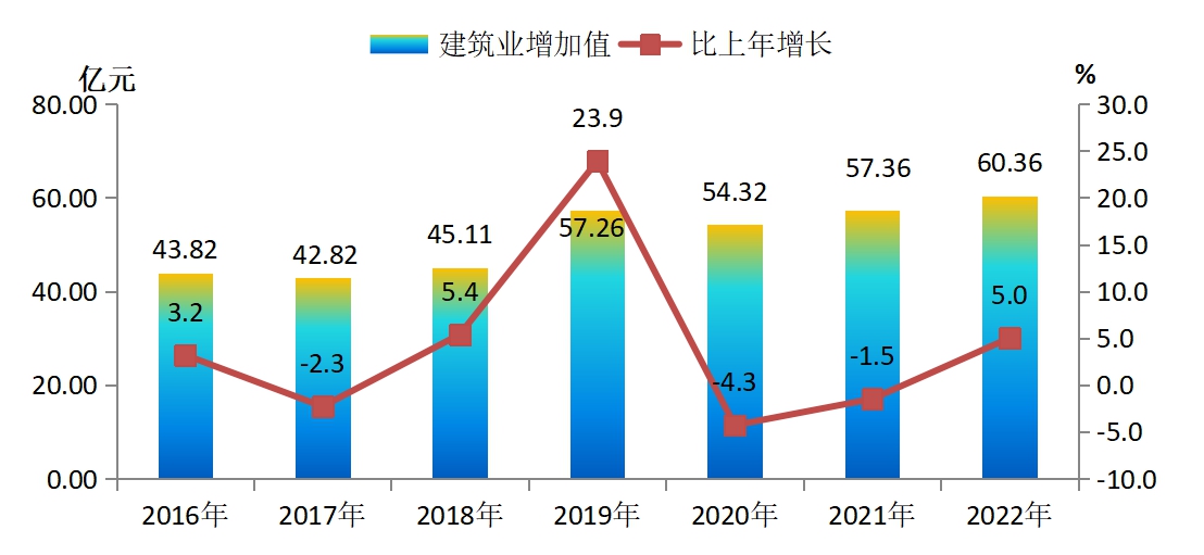 全年建筑业增加值60.36亿元,比上年增长5.0%。全州具有资质等级的总承包和专业承包建筑业总产值121.68亿元,比上年增长0.6%。其中,建筑工程产值113.19亿元,增长6.2%;安装工程产值5.14亿元,下降35.6%;其他建筑业产值3.36亿元,下降47.3%。房屋建筑施工面积678.22万平方米,下降14.5%。其中,新开工面积186.88万平方米,下降20.5%。