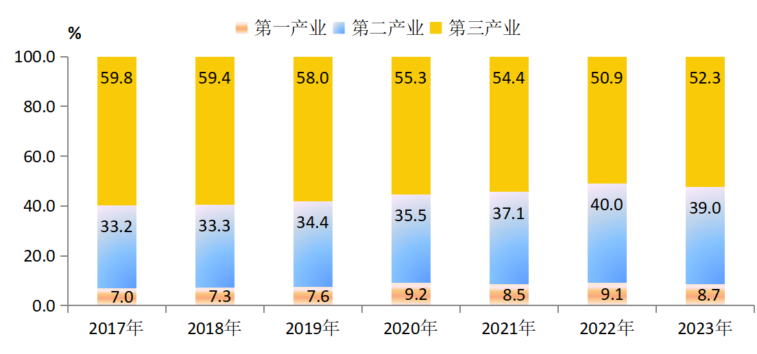 图2 2017-2023年三次产业增加值占地区生产总值比重