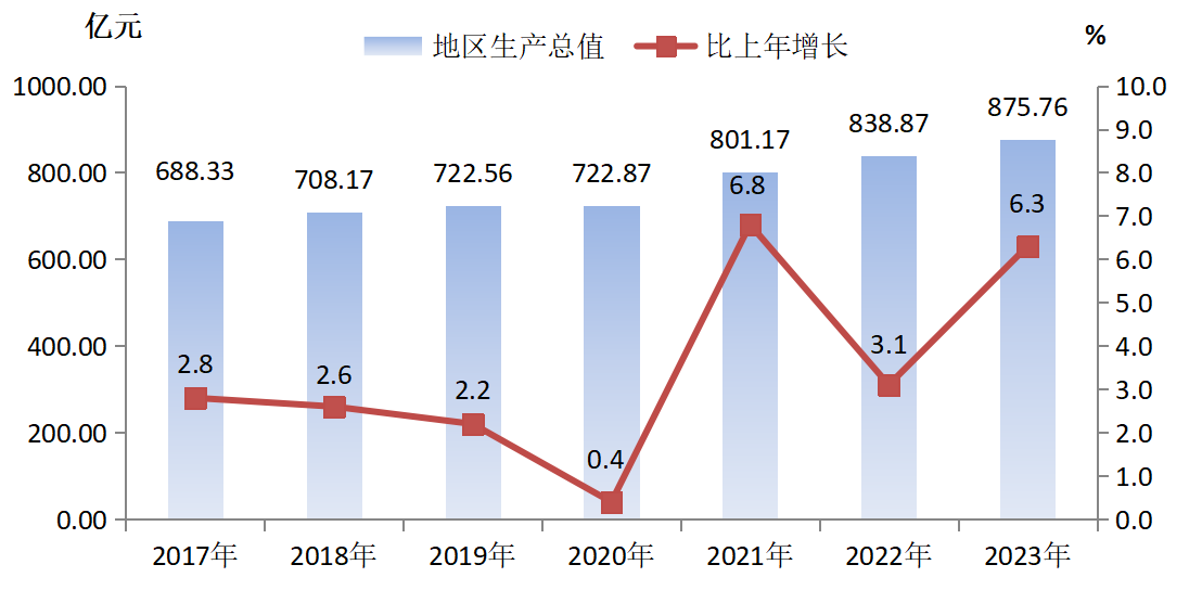 初步核算,全年地区生产总值[2]875.76亿元,比上年增长6.3%。其中,第一产业增加值76.31亿元,增长6.4%;第二产业增加值341.29亿元,增长3.3%;第三产业增加值458.16亿元,增长8.4%。第一产业增加值占地区生产总值比重为8.7%,第二产业增加值比重为39.0%,第三产业增加值比重为52.3%。按常住人口计算,全年人均地区生产总值46161元,比上年增长6.8%。