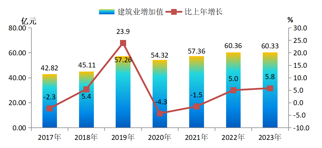 全年建筑业增加值60.33亿元,比上年增长5.8%。全州具有资质等级的总承包和专业承包建筑业总产值134.31亿元,比上年增长10.4%。其中,建筑工程产值127.95亿元,增长13.0%;安装工程产值2.49亿元,下降51.6%;其他建筑业产值3.87亿元,增长15.3%。房屋建筑施工面积548.20万平方米,下降19.2%。其中,新开工面积147.21万平方米,下降21.2%。