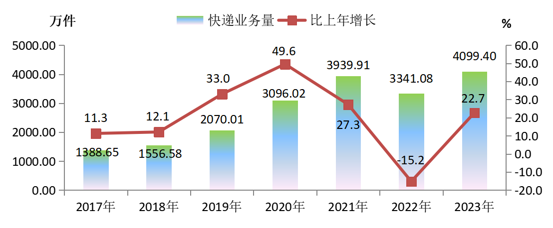 全年邮政行业业务总量9.67亿标准量,比上年增长16.3%。全年邮政行业寄递业务量完成6036.30万件,增长13.4%,其中邮政寄递服务业务量1936.91万件,下降2.3%;快递业务量4099.40万件,增长22.7%。全年邮政行业业务收入11.15亿元,增长17.7%。其中,邮政寄递服务收入0.28亿元,下降7.8%;快递业务收入5.60亿元,增长25.6%。