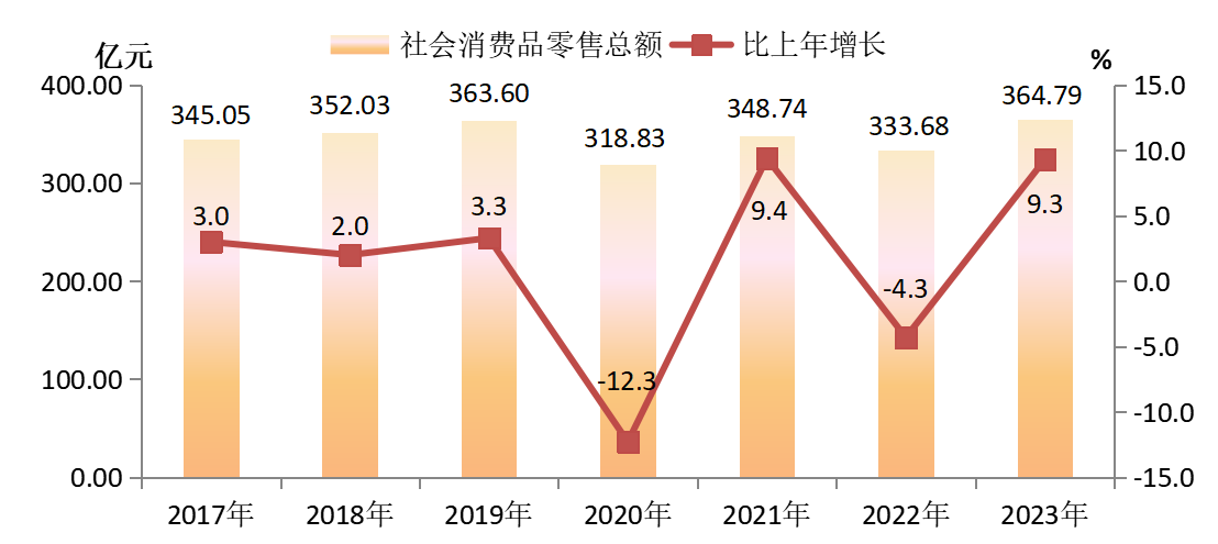 全年社会消费品零售总额364.79亿元,比上年增长9.3%。按经营地分,城镇消费品零售额328.78亿元,增长9.4%;农村消费品零售额36.00亿元,增长8.5%。按消费类型分,商品零售316.83亿元,增长7.9%;餐饮收入47.95亿元,增长19.5%。按行业分,批发业零售额22.22亿元,增长5.2%;零售业零售额295.43亿元,增长8.0%;住宿业零售额4.91亿元,增长20.3%;餐饮业零售额42.23亿元,下降20.7%。
