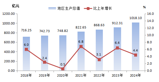 初步核算,全年地区生产总值[2]1018.10亿元,比上年增长4.4%。其中,第一产业增加值80.14亿元,增长5.1%;第二产业增加值334.71亿元,增长4.0%;第三产业增加值603.24亿元,增长4.5%。第一产业增加值占地区生产总值比重为7.9%,第二产业增加值比重为32.9%,第三产业增加值比重为59.2%。按常住人口计算,全年人均地区生产总值53582元,比上年增长4.8%。