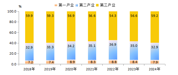 图2 2018-2024年三次产业增加值占地区生产总值比重