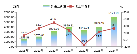 图4 2018-2024年快递业务量及其增长速度